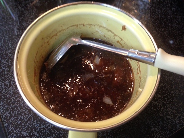 材料:玉ねぎ、にんにく、醤油、酒、みりん、鶏がらスープの素、水です。