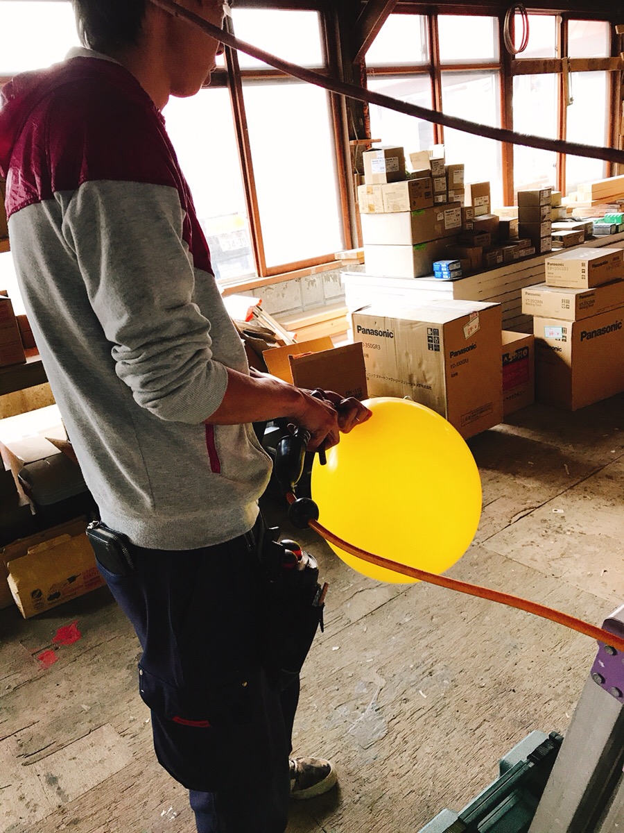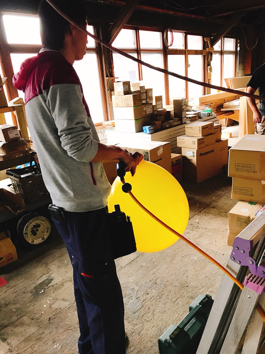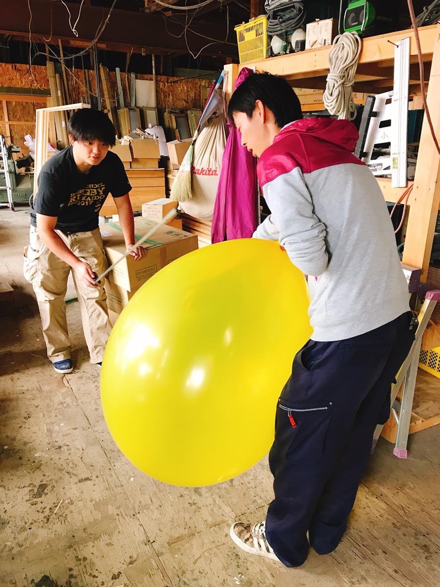 現場監督の雄輔さん、家具職人の瀬野君で風船を膨らまそうとしたところ