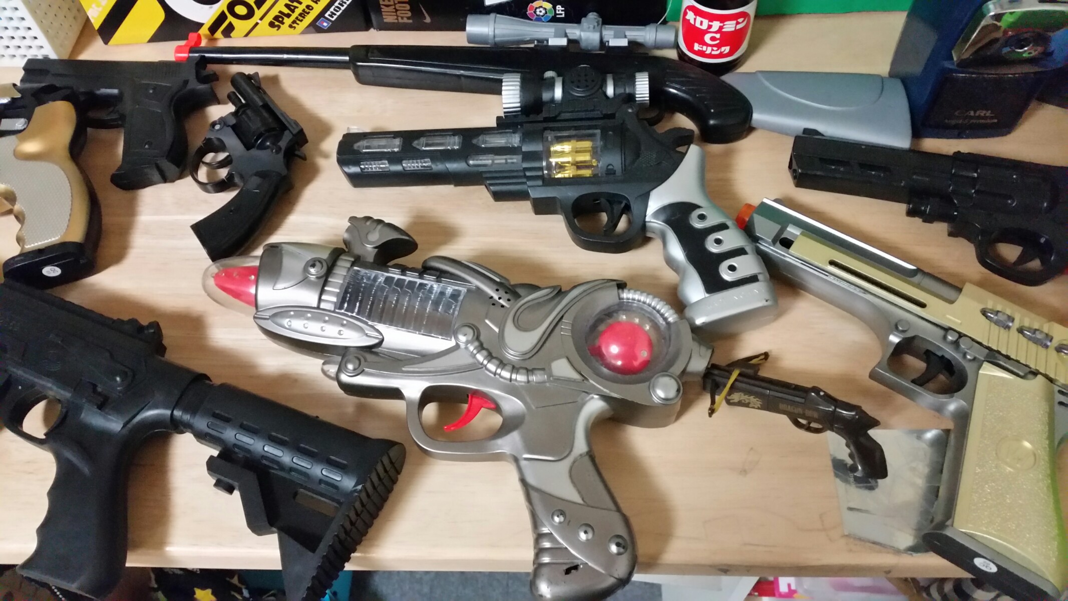 「おもちゃでも人に向けたらダメ」と、教えているのですが、家の中では良いと思っているのか?ベットの影に隠れよく私を狙っています。ヤメテ・・
