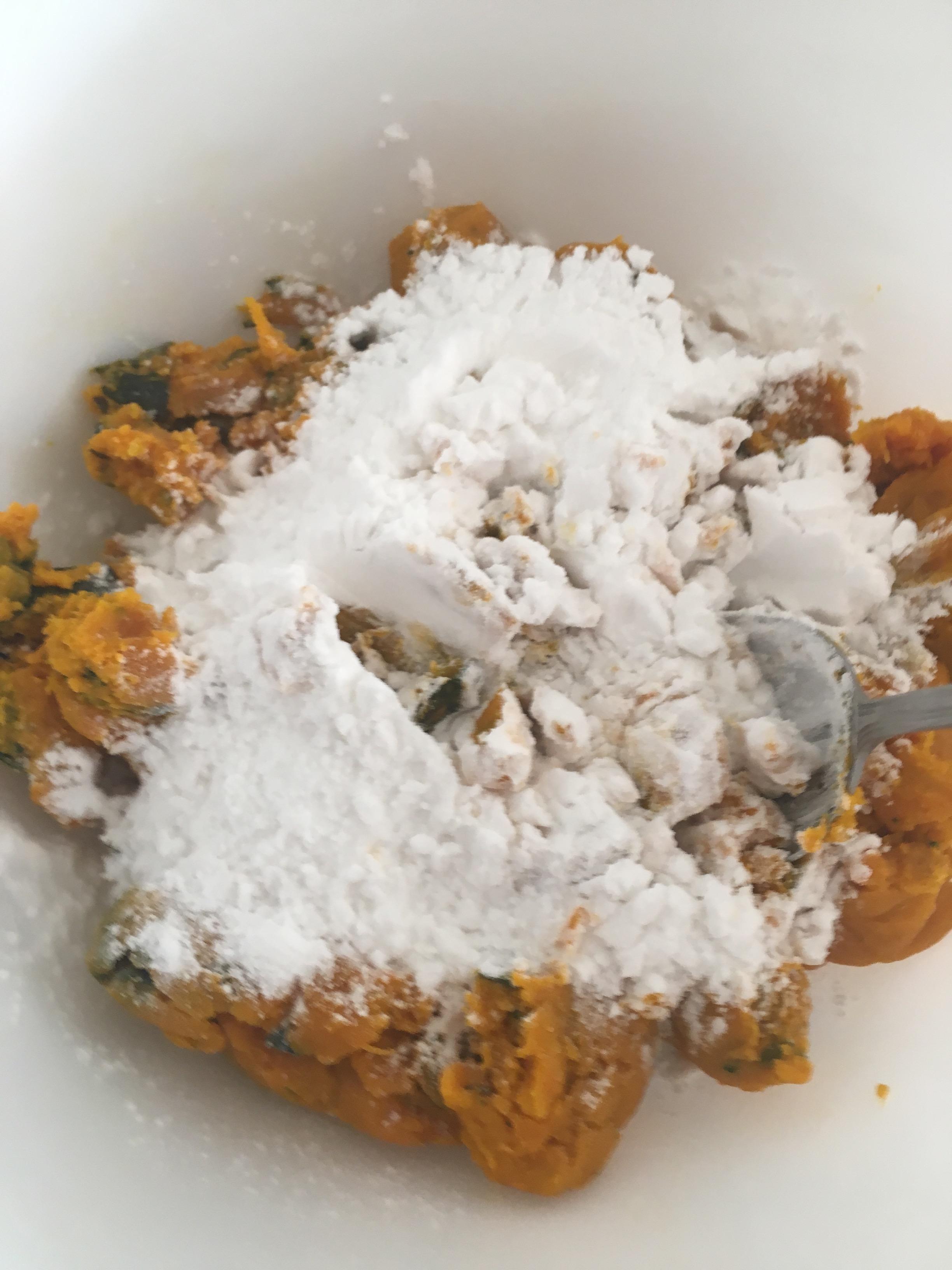 カボチャの2~3割くらいの分量の片栗粉を入れて、しっかり混ぜ、