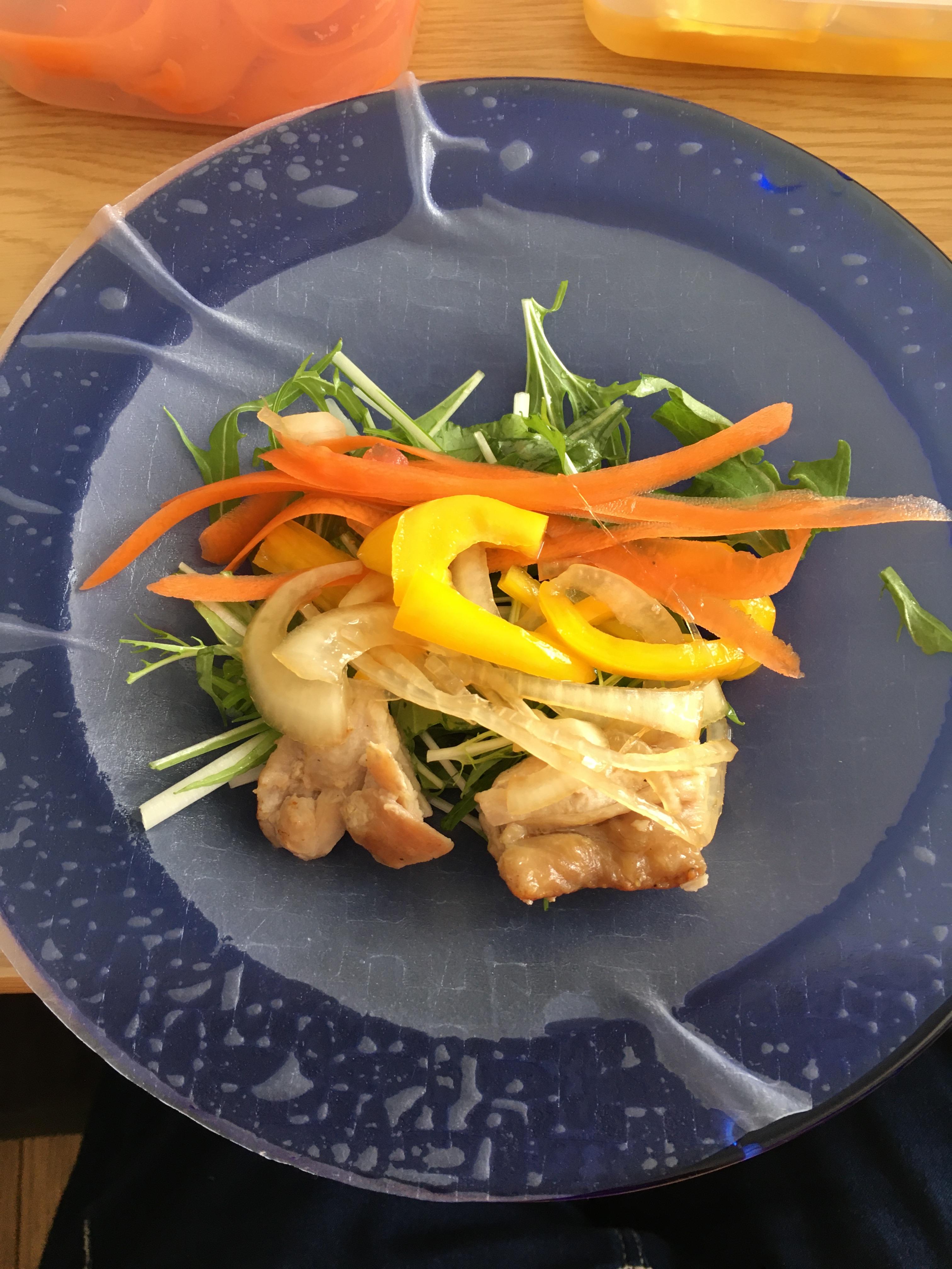 冷蔵庫にあった常備菜、サラダ用に切った野菜、皮を良く焼いた鶏肉、