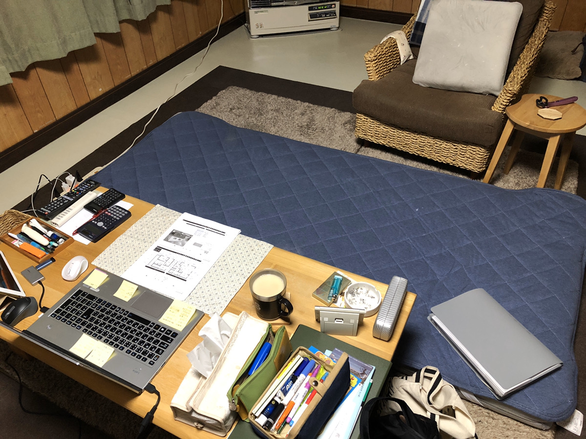 普段、ご飯を食べたり、PC作業したりするテーブルもロータイプなので座布団に座って