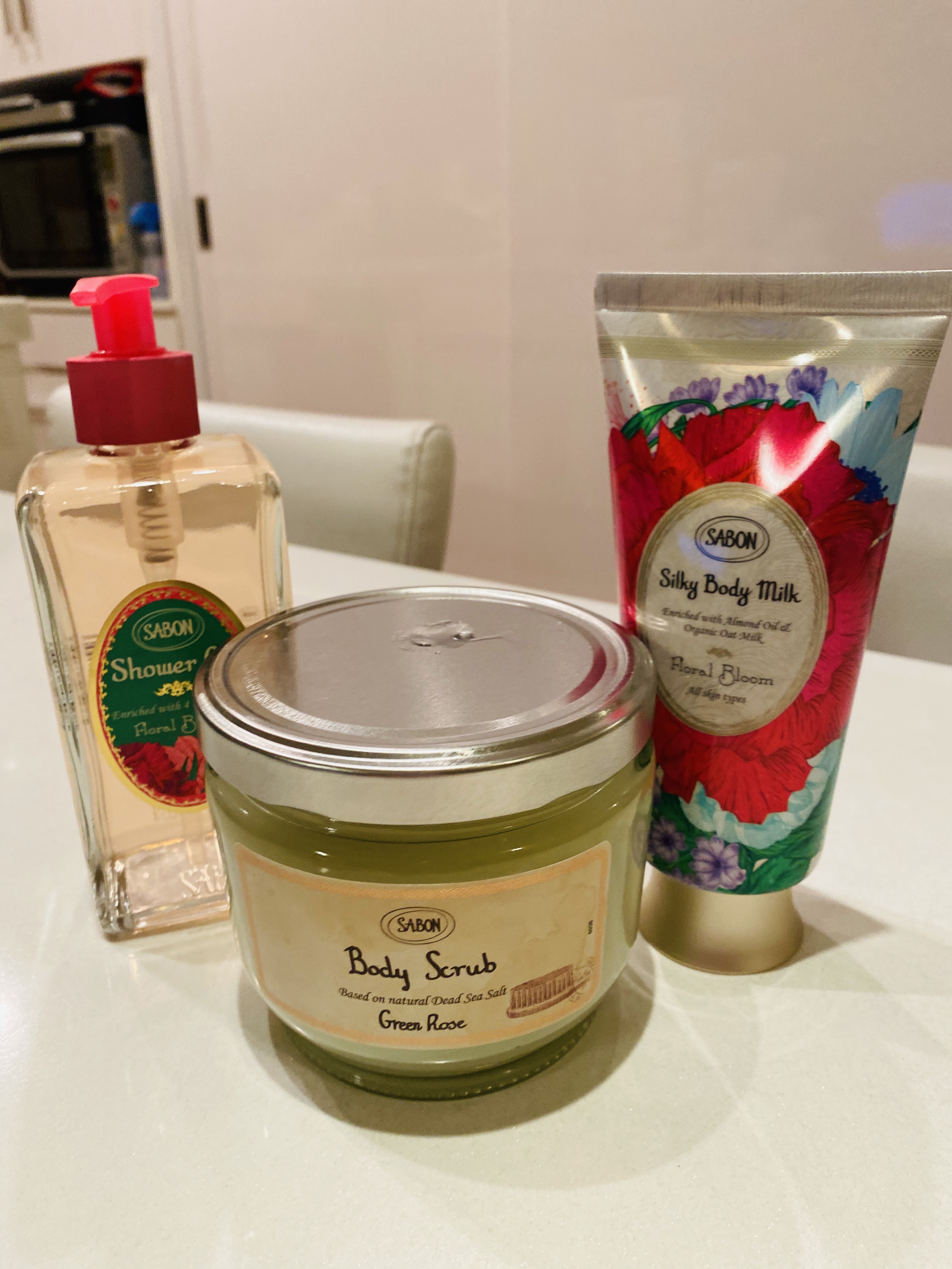 左からボディオイル、ボディスクラブ、ボディミルクです。