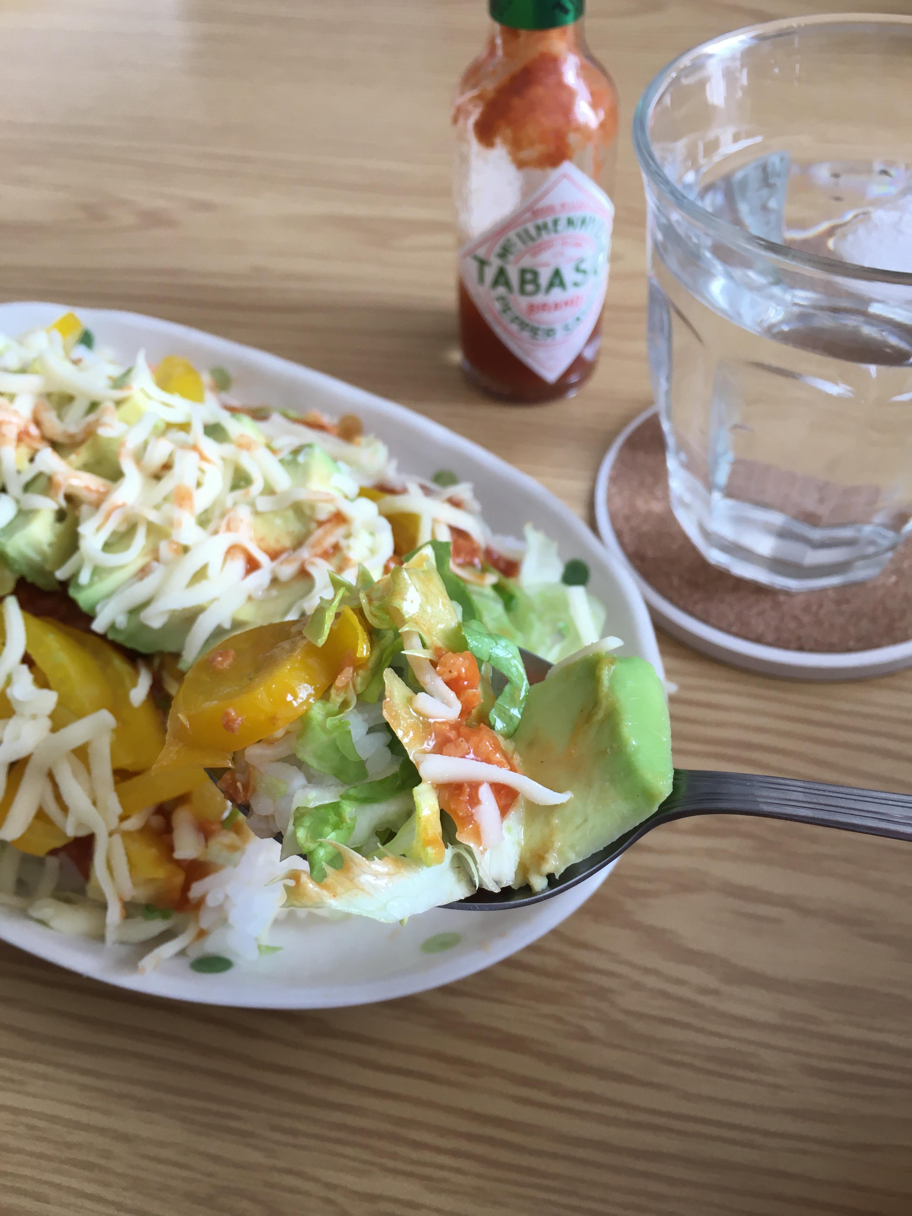 ご飯の上に、このソースをかけて、その上にレタス、アボカド、パプリカの酢漬け、チーズ...
