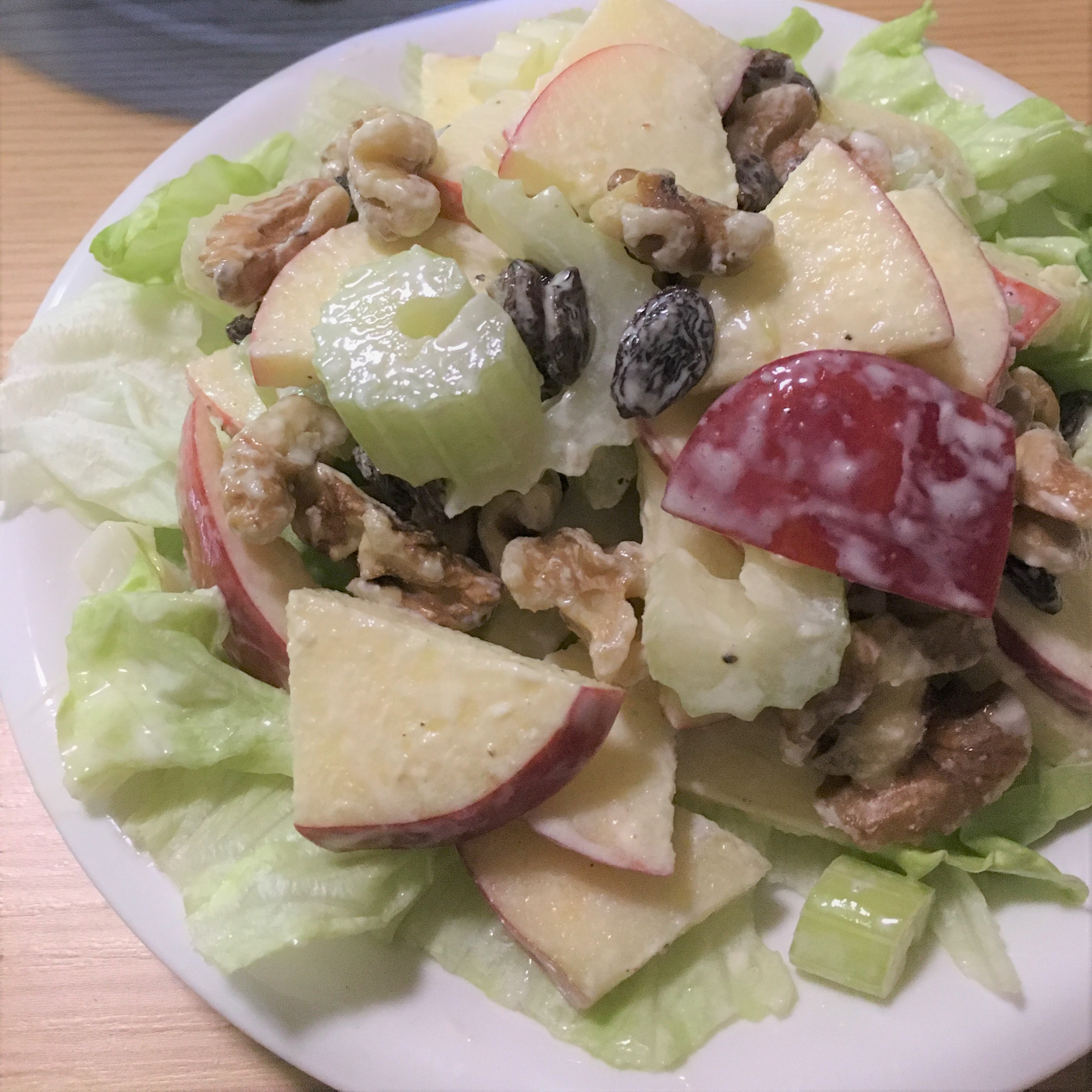 細かく切ったリンゴ、セロリ、マヨネーズを、レタスの上にトッピングしたサラダで、のちにはきざんだクルミも加えるようになった。