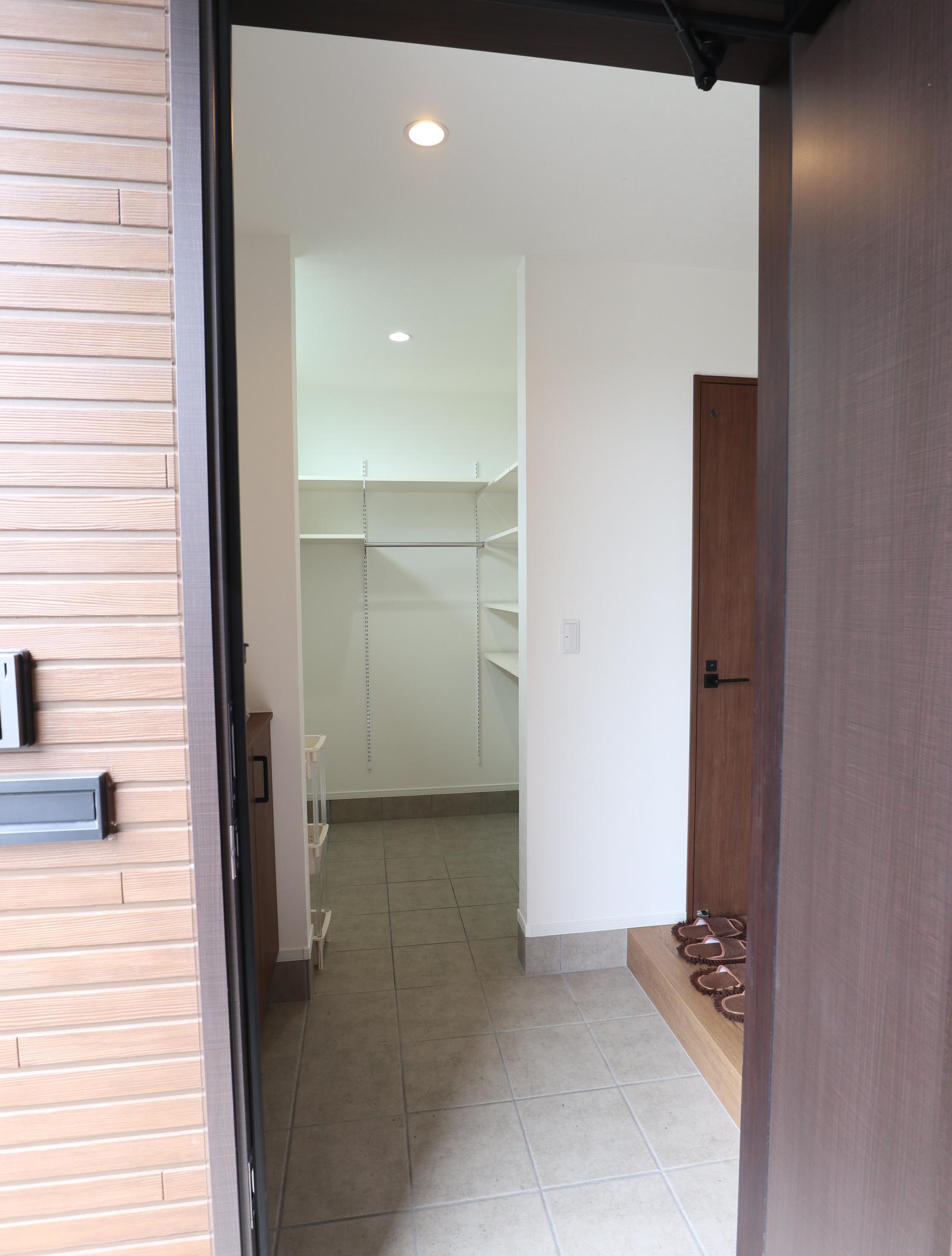 一坪サイズのシューズインクローク(玄関収納)はタイル仕上げが玄関とのつながりを印象強くさせて、お家の顔とも言えます玄関が広く感じますね!
