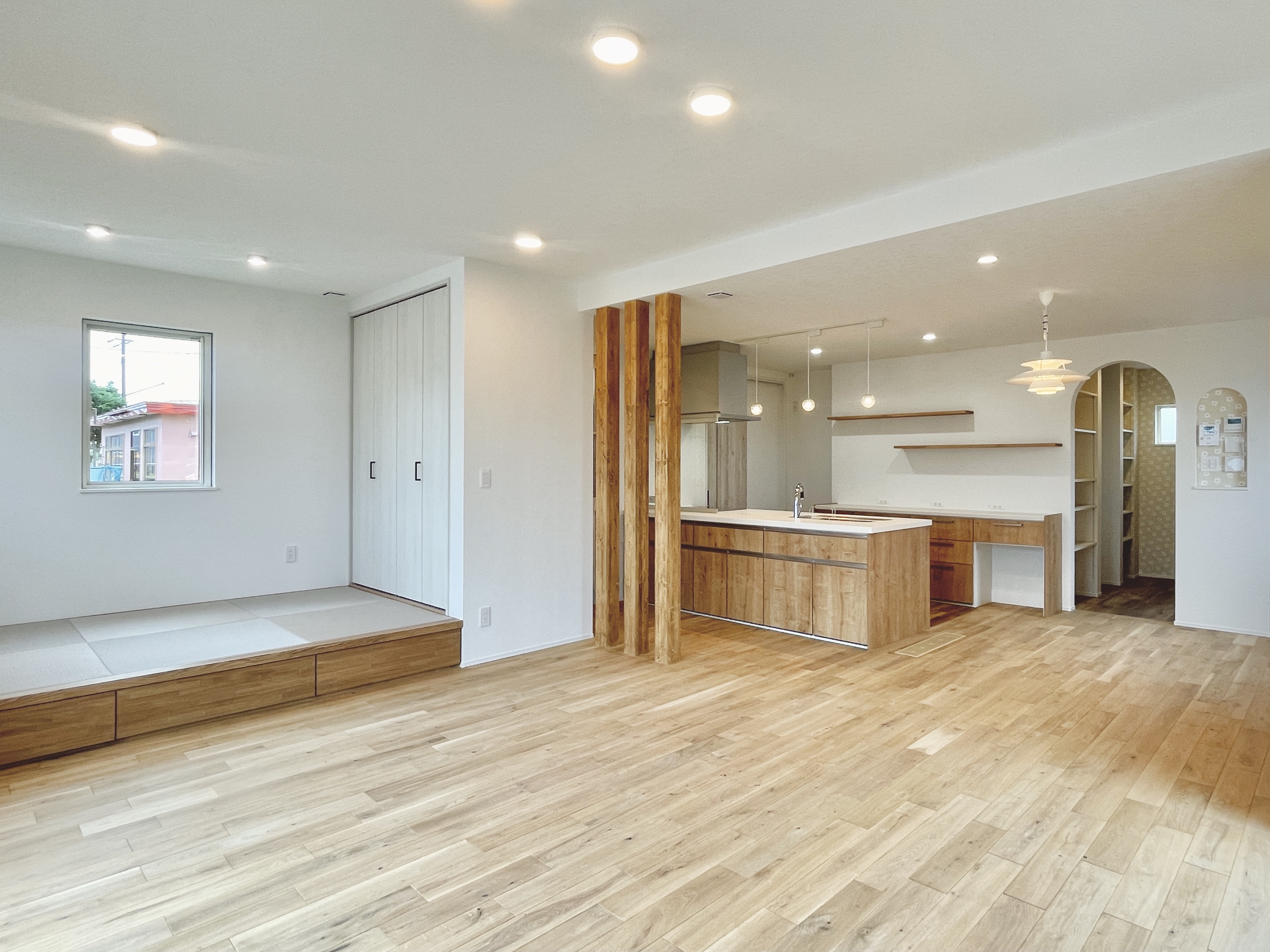 キッチン横のアーチ壁の先は、パントリーに繋がっています。