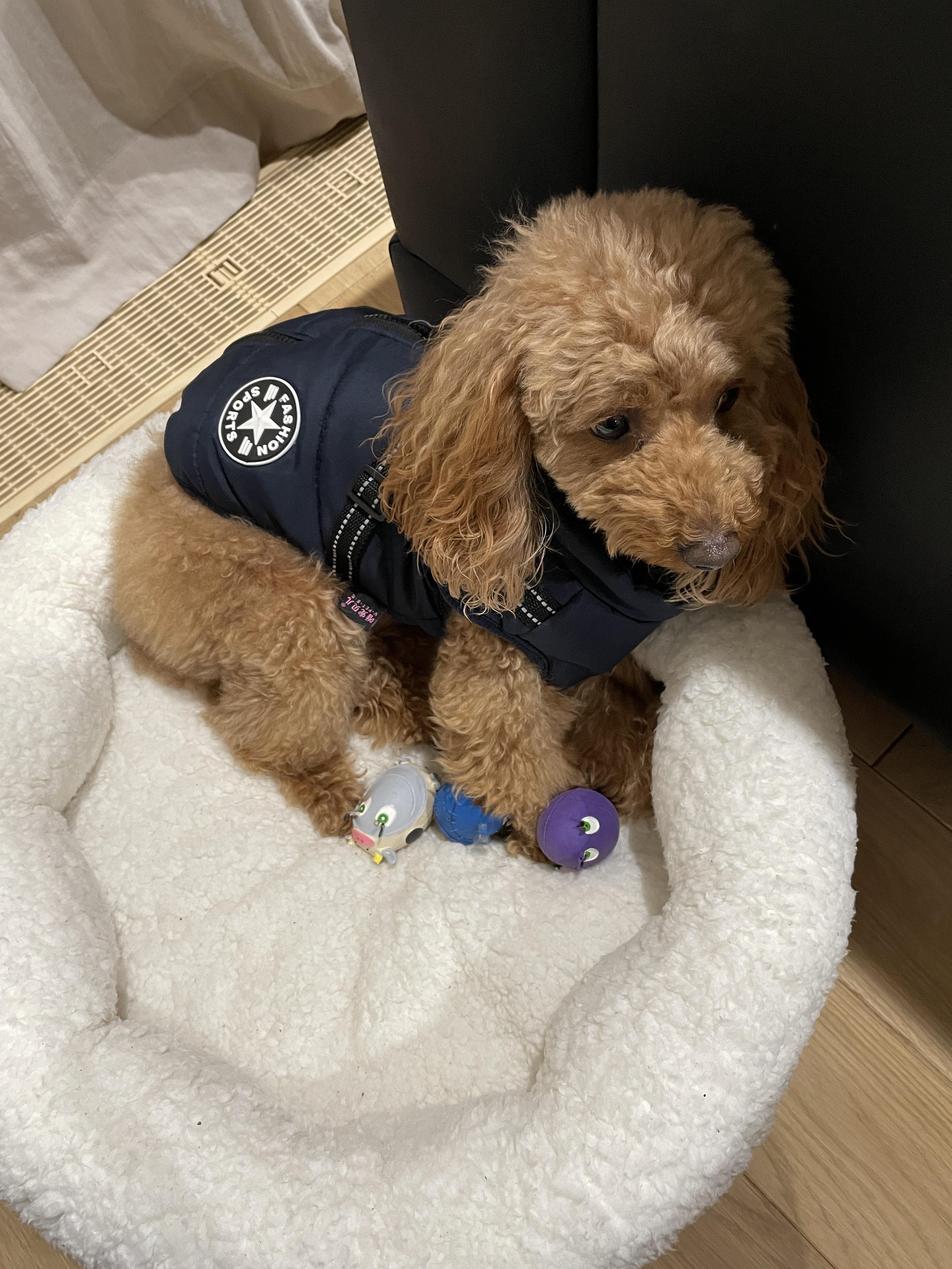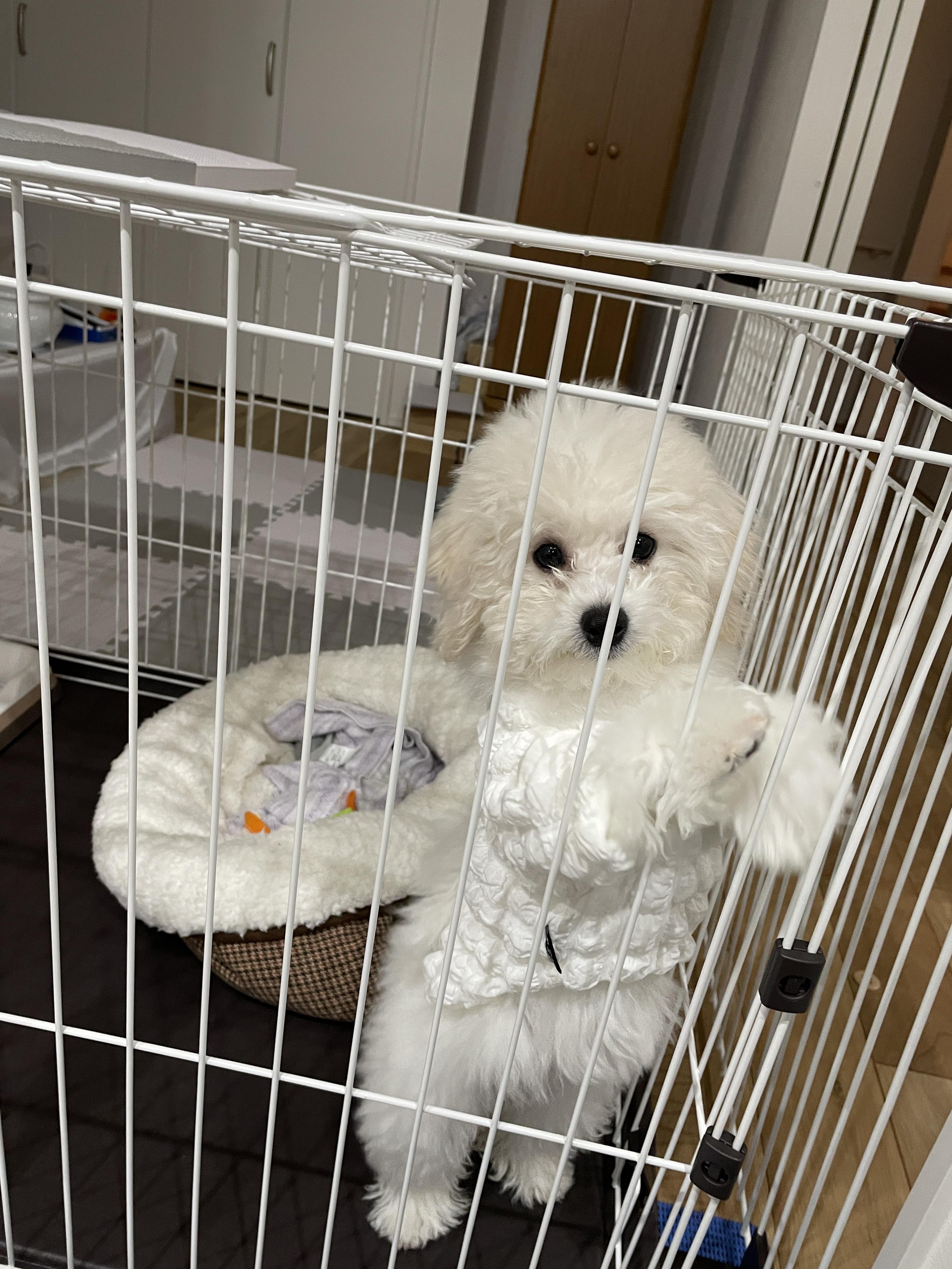 先輩のプードル(♂)は情けなくも新人ビションフリーゼ(♀)に対して怯えております。
