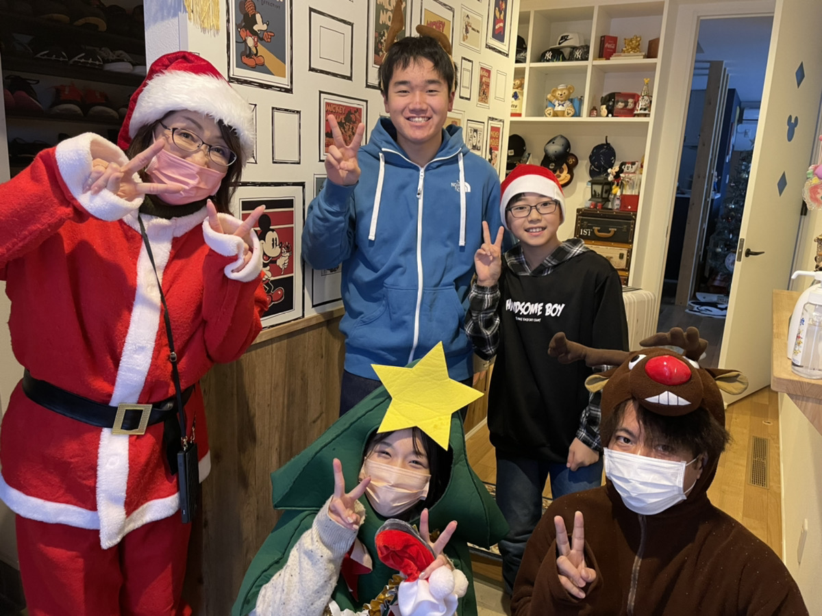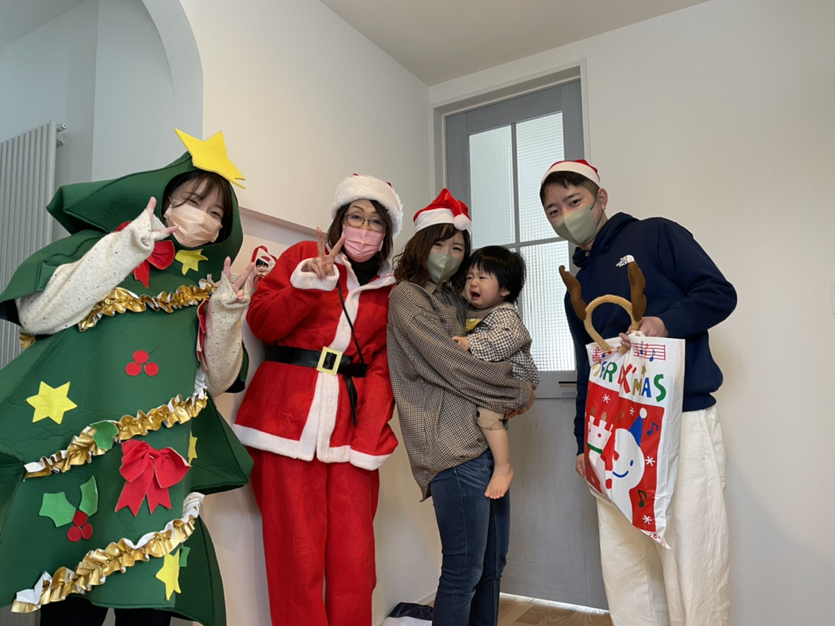 サンタクロースにトナカイにツリーのコスプレでプレゼントを抱え、お子様の喜ぶ顔を想像しながら「メリークリスマス!」と満面の笑顔で玄関を開けます!!