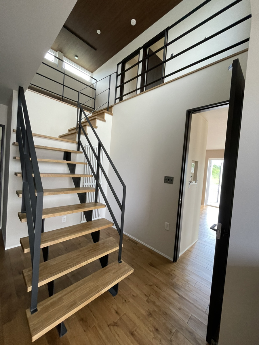 玄関ドアを開けるととても印象的なアイアンとスケルトンの階段が...