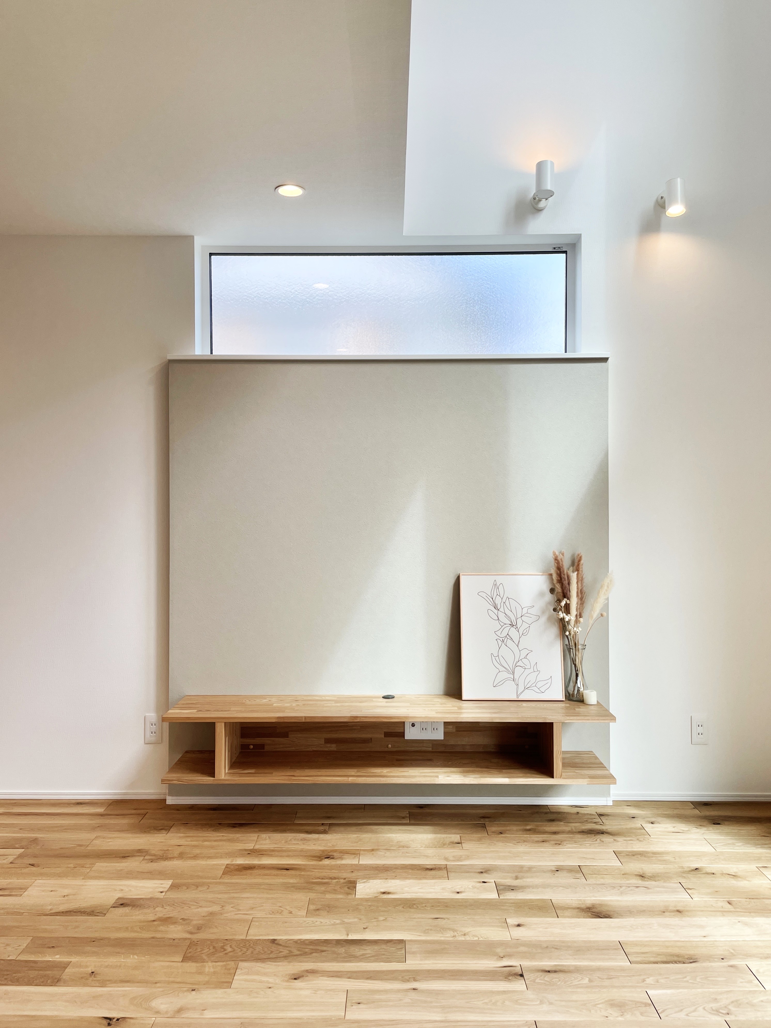 壁掛けテレビをかけるために、すこし厚みをもたせたグレーの壁と