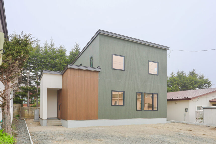グリーン×木目のコントラストが印象的な、洗練の外観デザイン