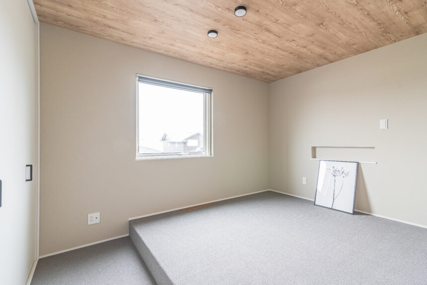 スキップフロアに設けたカーペット敷きの寝室は、落ち着きと特別感を兼ね備えた空間。