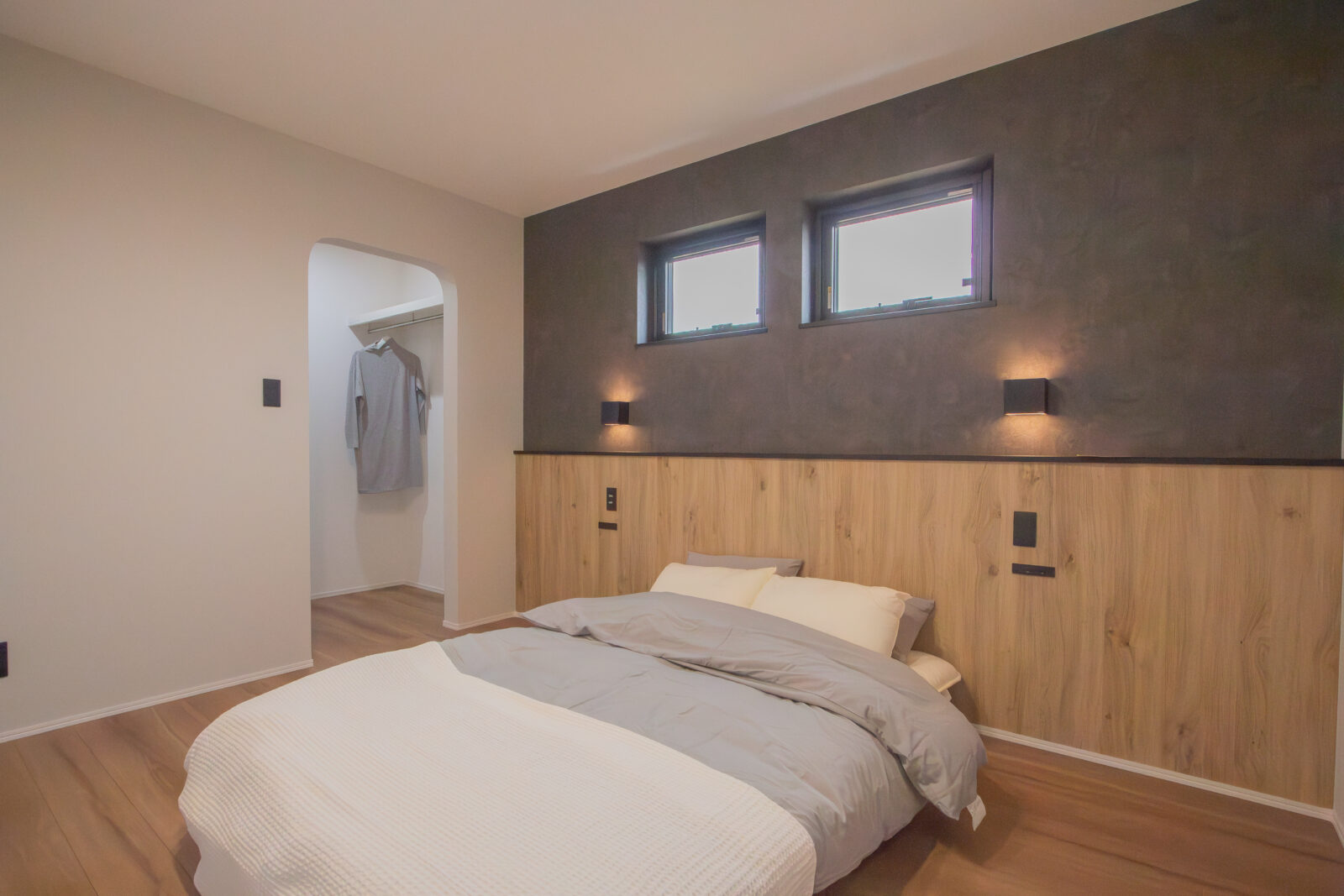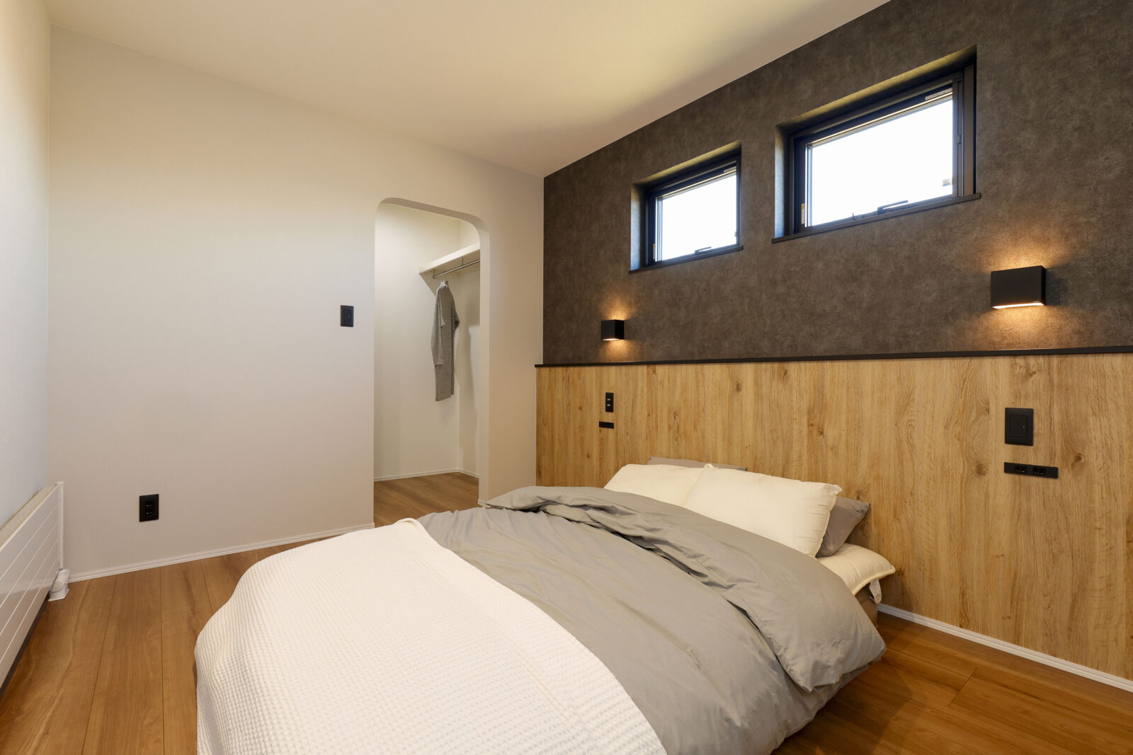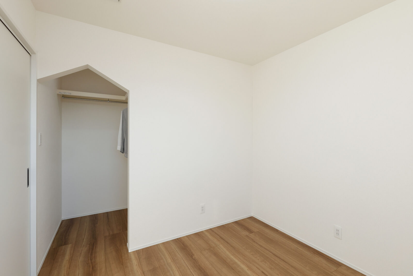 寝室は落ち着いた木目のアクセントクロスでリラックス感を演出。子ども部屋には三角の垂れ壁を取り入れ、秘密基地のような遊び心あるデザインが魅力です。
